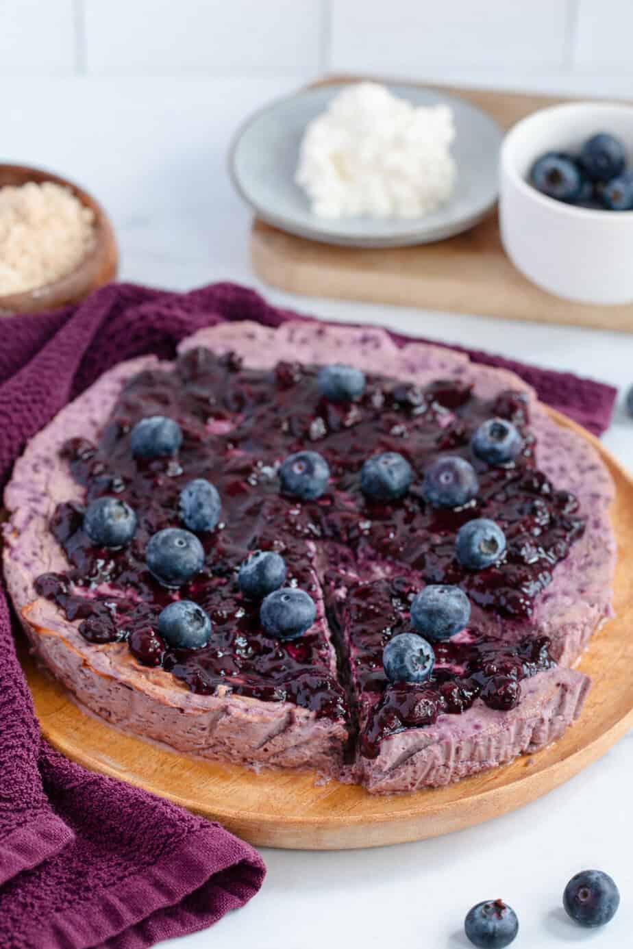 Blueberry cottage cheese cheesecake is a baked cheesecake made with cottage cheese, Greek yogurt, eggs, honey, almond flour, blueberries, and blueberry jam.