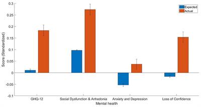 The estimate of the predictors in the generalized linear models trained on people without diabetes can be found in Table 2. The current study found that diabetes patients have worse overall mental health as indicated by the GHQ-12 summary score [t(2, 254) = 7.49, p < 0.001, Cohen’s d = 0.17, 95% CI (0.13, 0.22)], GHQ-12A [t(2, 254) = 7.46, p < 0.001, Cohen’s d = 0.18, 95% CI (0.13, 0.22)], GHQ-12B [t(2, 254) = 4.28, p < 0.001, Cohen’s d = 0.09, 95% CI (0.05, 0.13)], GHQ-12C [t(2, 254)=7.68, p < 0.001, Cohen’s d = 0.17, 95% CI (0.13, 0.21)]. The mean and standard error of predicted and actual standardized scores can be found in Figure 1.