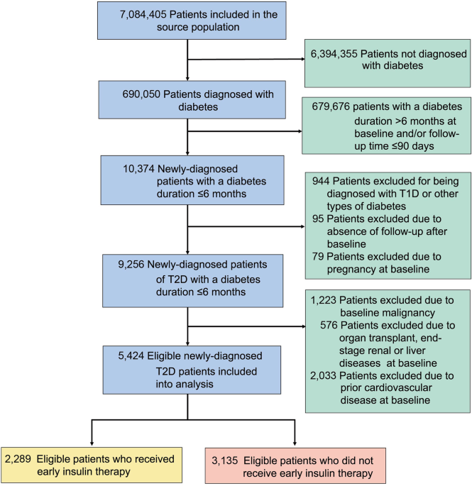 Descriptive statistics were compiled for baseline characteristics of study participants. t Test (continuous variables, normal distribution), Mann-Whitney test you Chi-squared tests (continuous variables, skewed distribution) and chi-squared tests (categorical variables) were used to compare T2D patients who received early insulin therapy with those who did not. Multiple imputation by chained equations with predictive mean matching techniques was applied to impute continuous data.